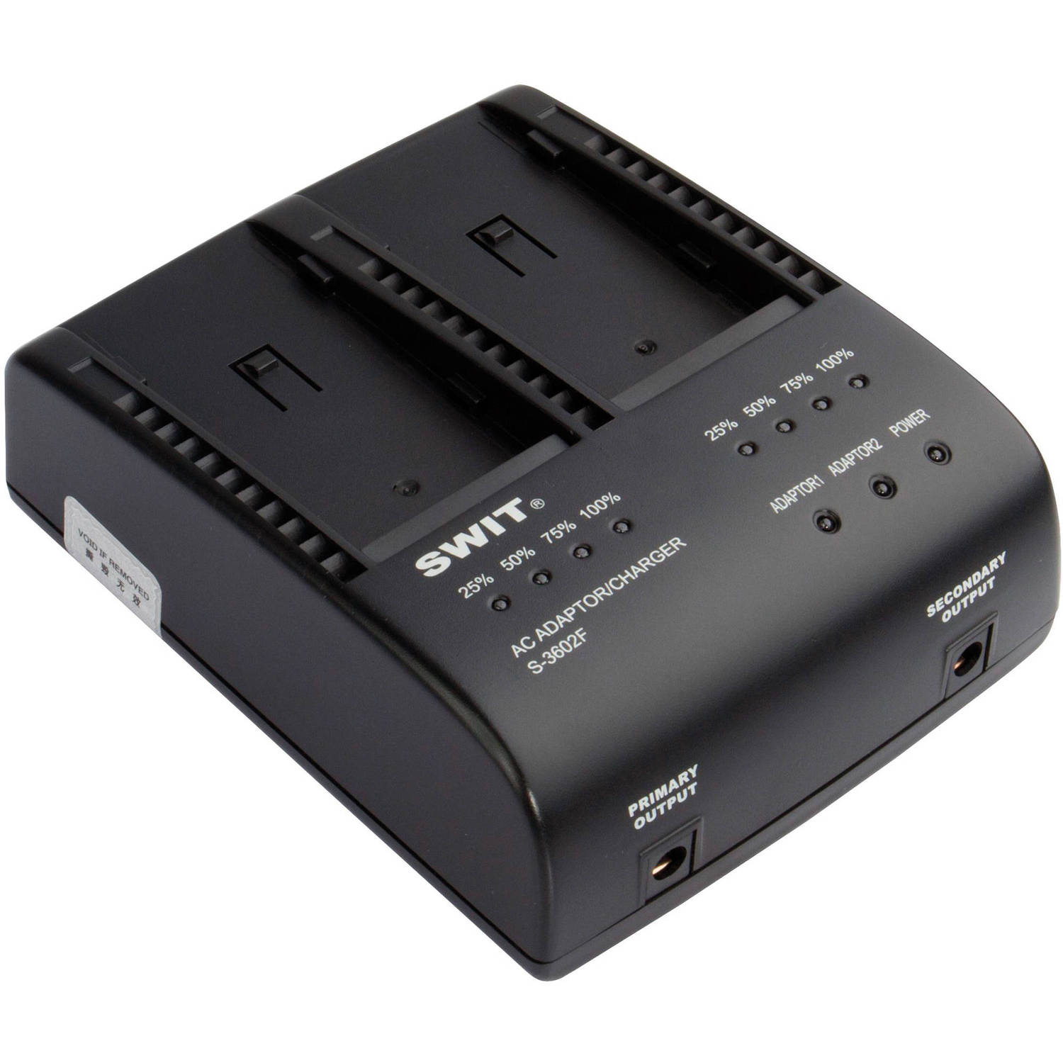 S-3602F имеет два разъёма с контактами 5,5 мм/2,1 мм для подключения к выходу постоянного тока. Выходы постоянного тока работают одновременно и обеспечивают суммарное напряжение 8,4 В постоянного тока и силу тока 3,5 А. Дополнительный аксессуар: адаптер-заглушка S-7500F для аккумуляторов SONY серии L для подключения камер SONY DV с аккумуляторами серии L или оборудования с держателями для аккумуляторов SONY серии L.